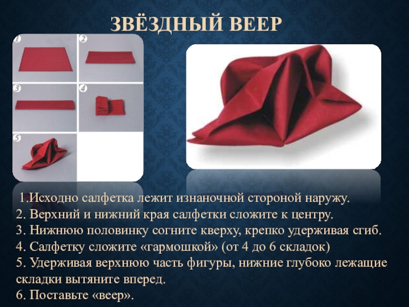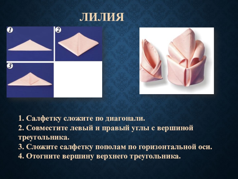 сложенная салфетка украшает стол. Существует много способов складывания салфеток. Но