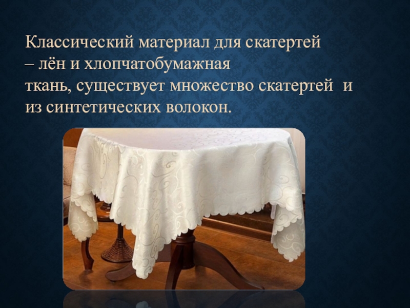 Слайд 6Классический материал для скатертей – лён и хлопчатобумажная