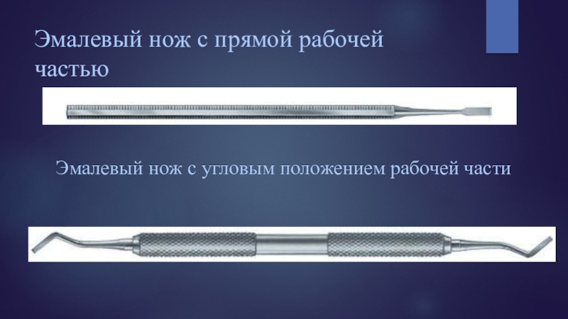 при удалении нависающих и истонченных краев эмали, сглаживании и формировании стенок кариозной полости и фальцировании края эмали. Рабочая часть инструмента, содержащая одну прямую режущую грань, может находиться на длинной оси или располагаться под углом 45° к ручке инструмента.