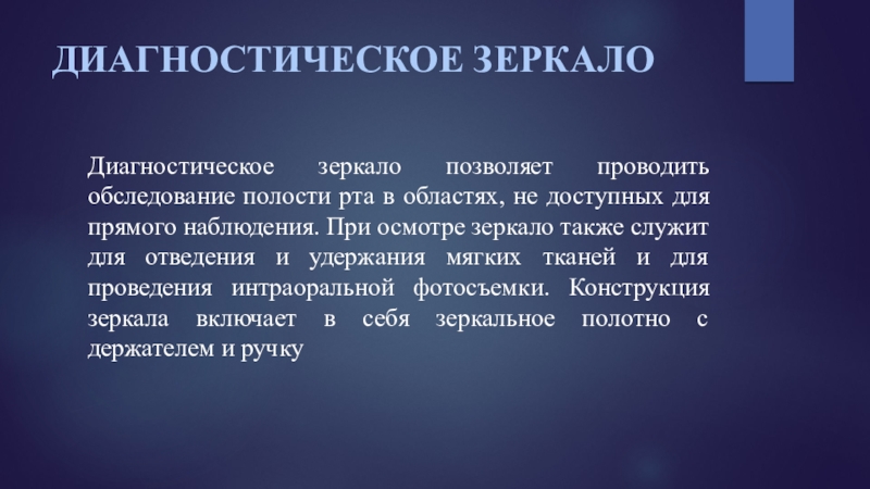 для отведения и удержания мягких тканей и для проведения интраоральной фотосъемки. Конструкция зеркала включает в себя зеркальное полотно с держателем и ручку