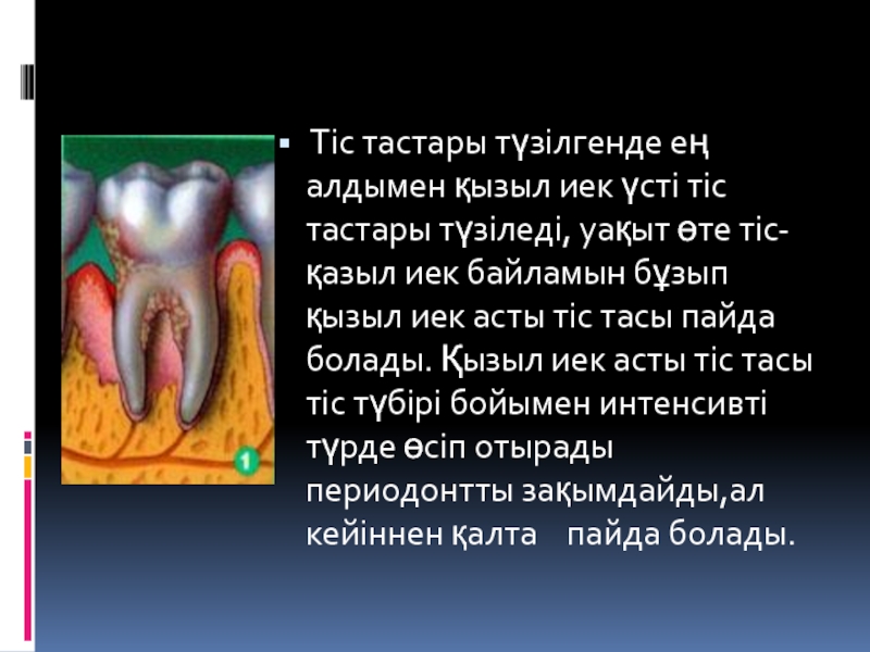 асты тіс тасы пайда болады. Қызыл иек асты тіс тасы тіс түбірі бойымен интенсивті түрде өсіп отырады периодонтты зақымдайды,ал кейіннен қалта пайда болады.