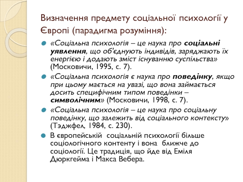 Слайд 21Визначення предмету соціальної психології у Європі (парадигма розуміння):