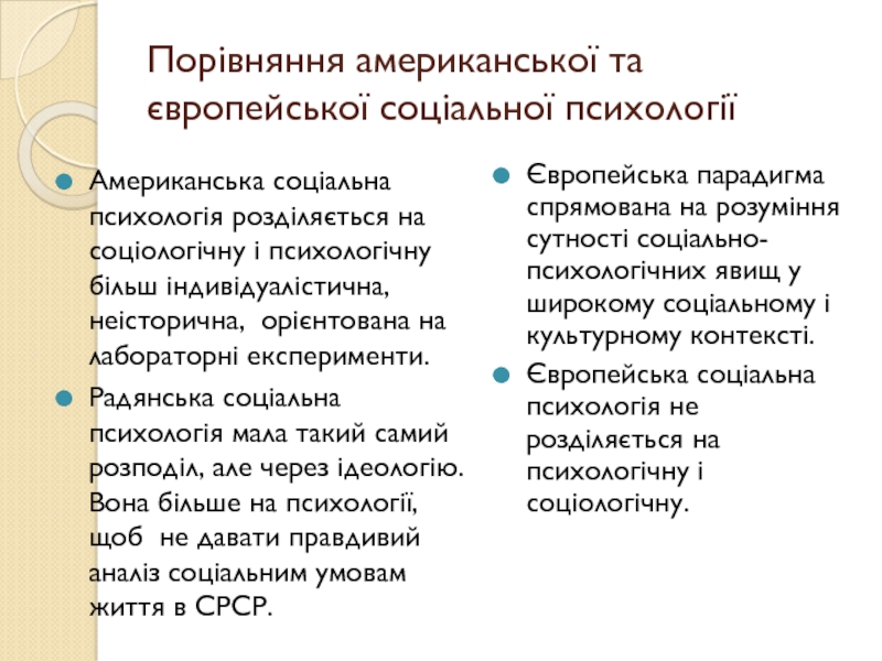 соціологічну і психологічну більш індивідуалістична, неісторична, орієнтована на лабораторні експерименти.