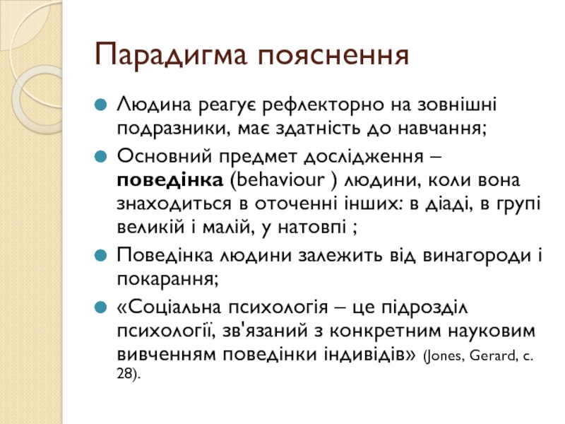 «Соціальна психологія – це підрозділ психології, зв'язаний з конкретним науковим вивченням поведінки індивідів» (Jones, Gerard, c. 28).