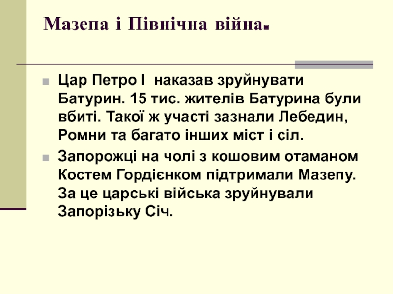 Запорожці на чолі з кошовим отаманом Костем Гордієнком підтримали Мазепу. За це царські війська зруйнували Запорізьку Січ.