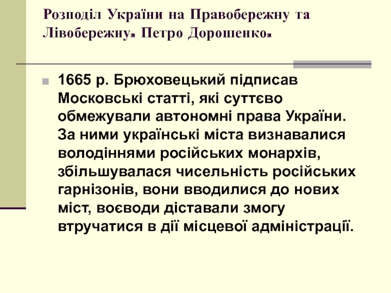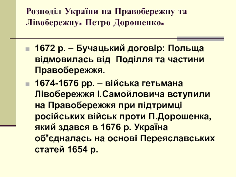 Слайд 20Розподіл України на Правобережну та Лівобережну. Петро Дорошенко.