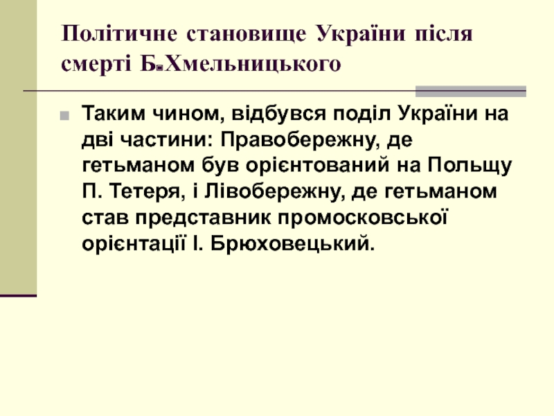 П. Тетеря, і Лівобережну, де гетьманом став представник промосковської орієнтації І. Брюховецький.