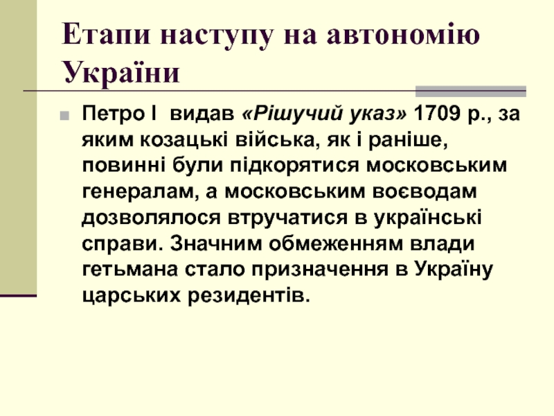 підкорятися московським генералам, а московським воєводам дозволялося втручатися в українські справи. Значним обмеженням влади гетьмана стало призначення в Україну царських резидентів.