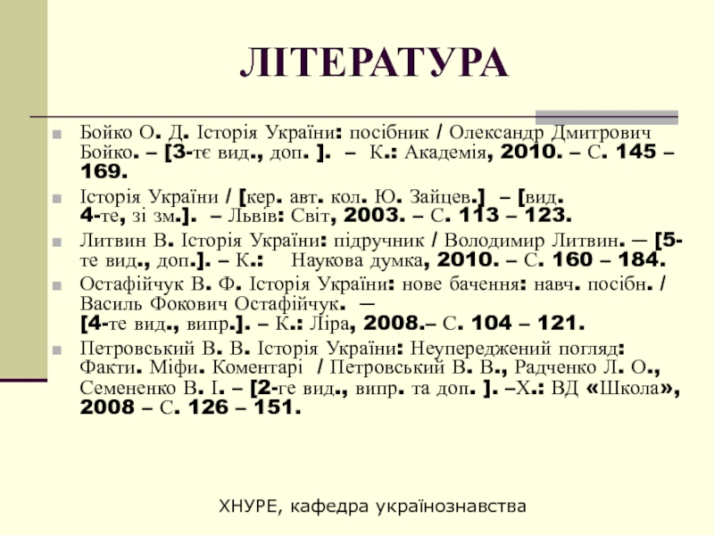 Литвин В. Історія України: підручник / Володимир Литвин. ─ [5-те вид., доп.]. – К.: Наукова думка, 2010. – С. 160 – 184.