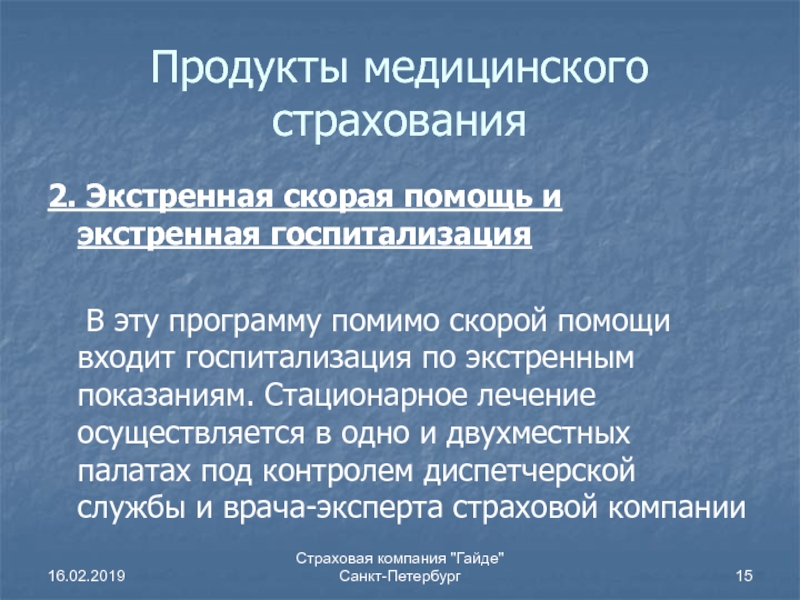 В эту программу помимо скорой помощи входит госпитализация по экстренным показаниям. Стационарное лечение осуществляется в одно и двухместных палатах под контролем диспетчерской службы и врача-эксперта страховой компании