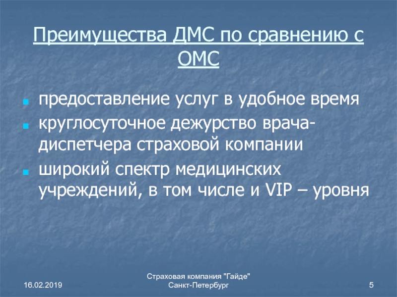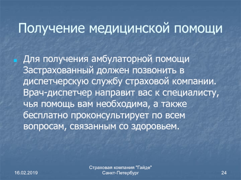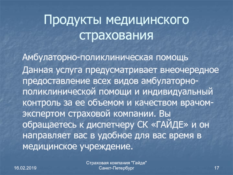Данная услуга предусматривает внеочередное предоставление всех видов амбулаторно-поликлинической помощи и индивидуальный контроль за ее объемом и качеством врачом-экспертом страховой компании. Вы обращаетесь к диспетчеру СК «ГАЙДЕ» и он направляет вас в удобное для вас время в медицинское учреждение.