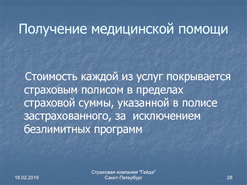 Стоимость каждой из услуг покрывается страховым полисом в пределах страховой суммы, указанной в полисе застрахованного, за исключением безлимитных программ