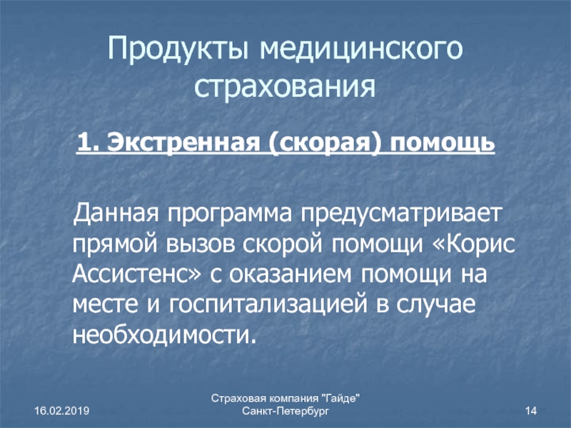 Данная программа предусматривает прямой вызов скорой помощи «Корис Ассистенс» с оказанием помощи на месте и госпитализацией в случае необходимости.