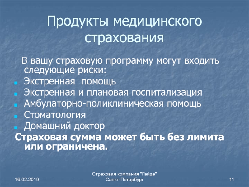 Отдел медицинского страхования СК «ГАЙДЕ» располагает широким спектром продуктов медицинского страхования. Мы предлагаем высококвалифицированные медицинские услуги по разумной цене.