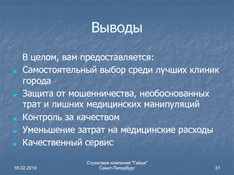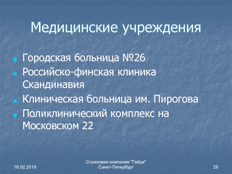 СК «ГАЙДЕ» сотрудничает только с признанными медицинскими учреждениями, отличающимися высоким качеством обслуживания. Кроме того, благодаря независимому контролю нашего врача, вы избежите лишних трат и ненужных процедур.