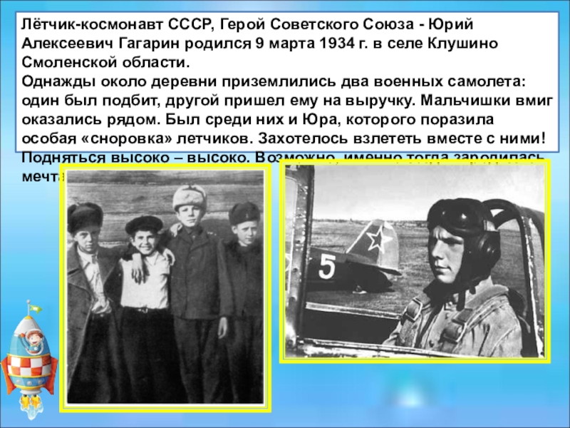 Слайд 15Лётчик-космонавт СССР, Герой Советского Союза - Юрий Алексеевич Гагарин родился