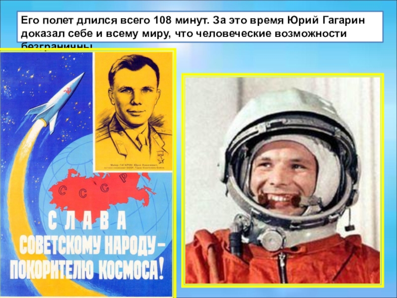 Слайд 18Его полет длился всего 108 минут. За это время Юрий