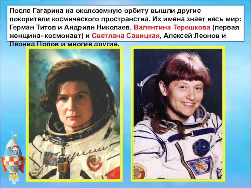 Слайд 19После Гагарина на околоземную орбиту вышли другие покорители космического пространства.
