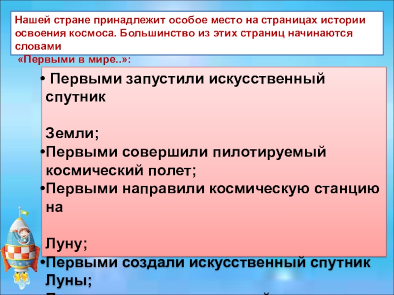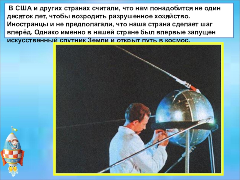 не предполагали, что наша страна сделает шаг вперёд. Однако именно в нашей стране был впервые запущен искусственный спутник Земли и открыт путь в космос.