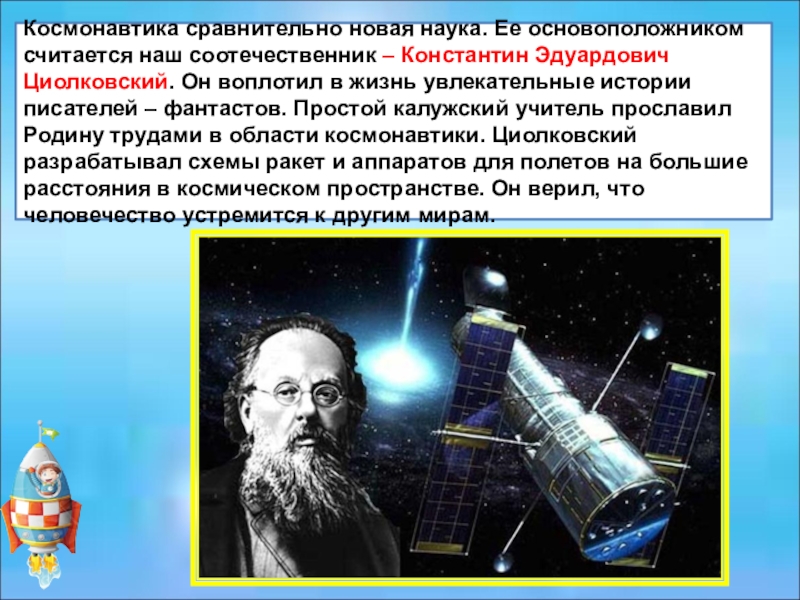 Слайд 7Космонавтика сравнительно новая наука. Ее основоположником считается наш соотечественник –
