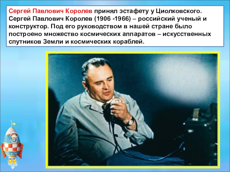 Слайд 10Сергей Павлович Королев принял эстафету у Циолковского.