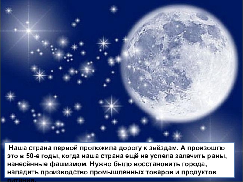 Слайд 5 Наша страна первой проложила дорогу к звёздам. А произошло