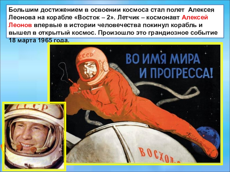 Слайд 20Большим достижением в освоении космоса стал полет Алексея Леонова на