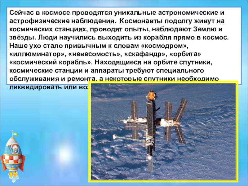 Слайд 25Сейчас в космосе проводятся уникальные астрономические и астрофизические наблюдения. Космонавты