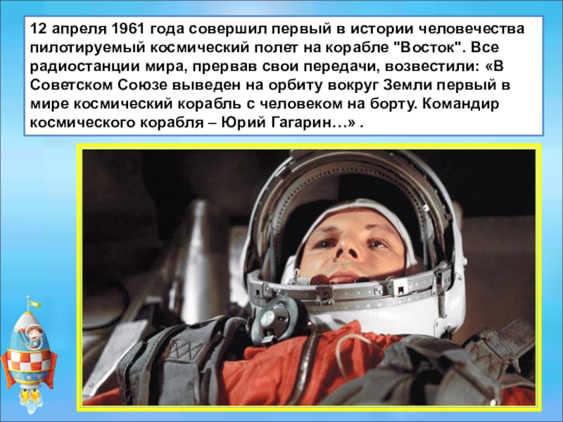 передачи, возвестили: «В Советском Союзе выведен на орбиту вокруг Земли первый в мире космический корабль с человеком на борту. Командир космического корабля – Юрий Гагарин…» .