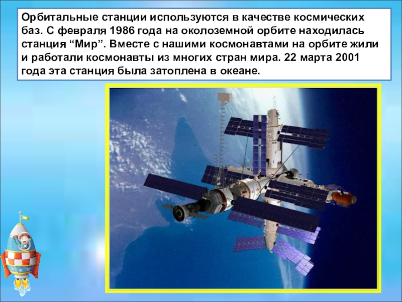 Слайд 26Орбитальные станции используются в качестве космических баз. С февраля 1986