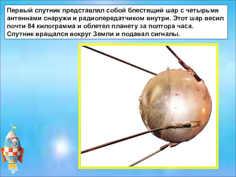 Слайд 9Первый спутник представлял собой блестящий шар с четырьмя антеннами снаружи