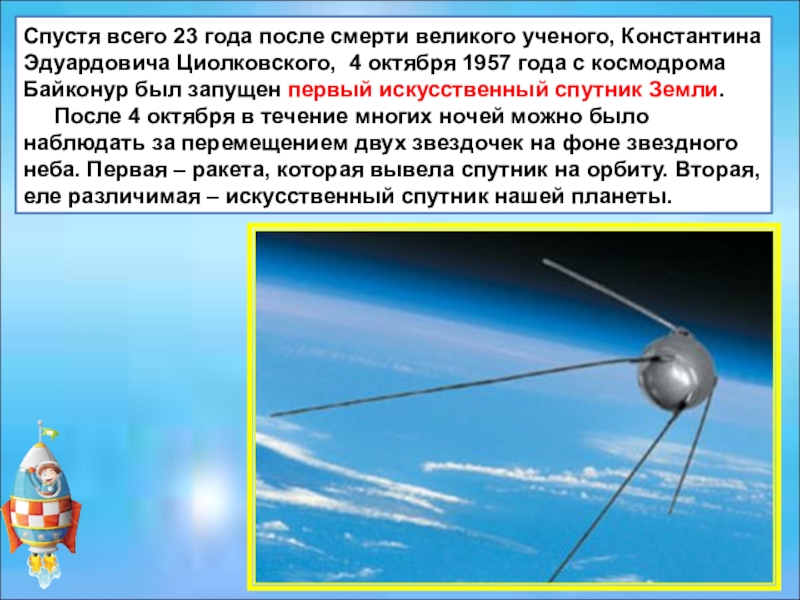 Циолковского, 4 октября 1957 года с космодрома Байконур был запущен