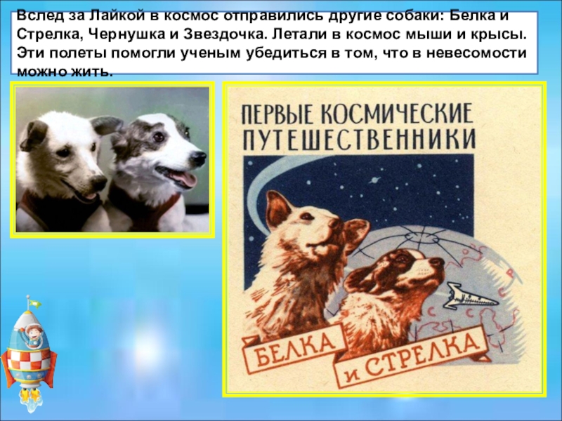 Слайд 13Вслед за Лайкой в космос отправились другие собаки: Белка и