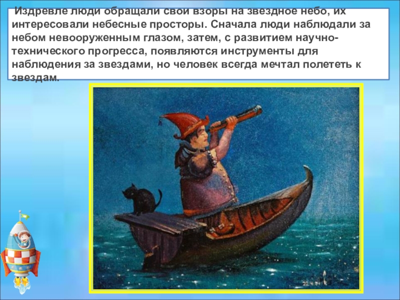 с развитием научно-технического прогресса, появляются инструменты для наблюдения за звездами, но человек всегда мечтал полететь к звездам.