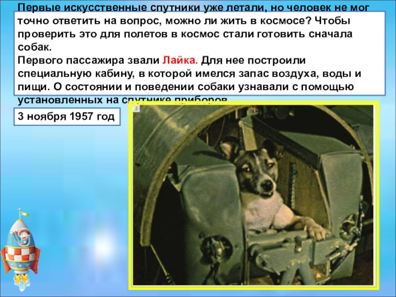 Первого пассажира звали Лайка. Для нее построили специальную кабину, в которой имелся запас воздуха, воды и пищи. О состоянии и поведении собаки узнавали с помощью установленных на спутнике приборов.