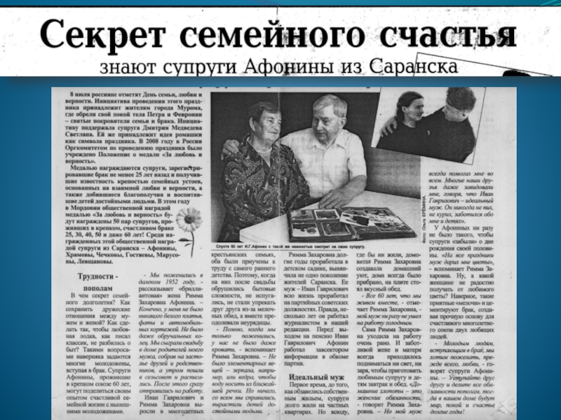 Праздник этот решено было назвать Днем семьи, любви и верности. Инициативу эту поддержали и многие общественные организации, и Русская Православная церковь, и все религиозные организации России. Оргкомитет празднования возглавила Президент Фонда социально-культурных инициатив Светлана Владимировна Медведева.