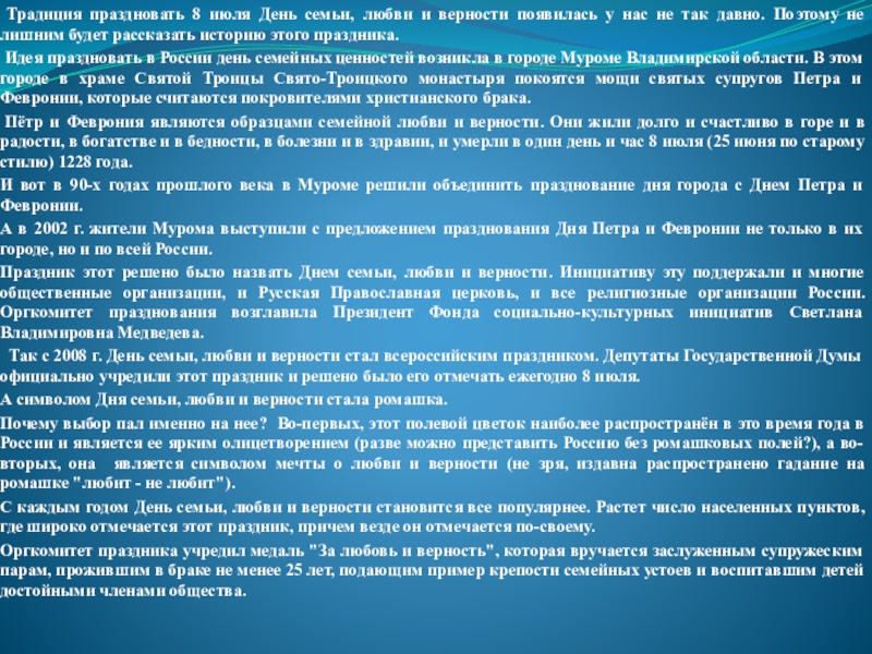 рассказать историю этого праздника.Идея праздновать в России день семейных ценностей возникла в городе Муроме Владимирской области. В этом городе в храме Святой Троицы Свято-Троицкого монастыря покоятся мощи святых супругов Петра и Февронии, которые считаются покровителями христианского брака.