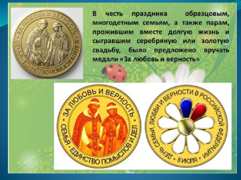 Оргкомитет праздника учредил медаль "За любовь и верность", которая вручается заслуженным супружеским парам, прожившим в браке не менее 25 лет, подающим пример крепости семейных устоев и воспитавшим детей достойными членами общества.