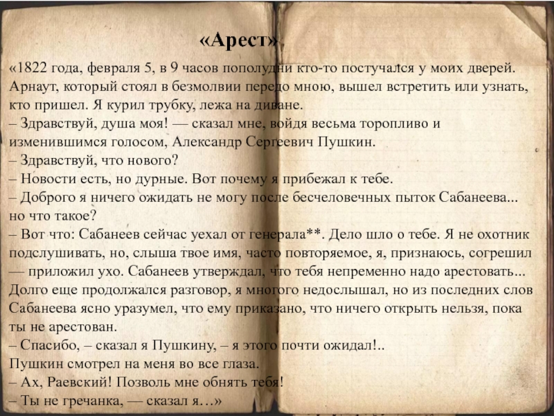 – Здравствуй, душа моя! — сказал мне, войдя весьма торопливо и изменившимся голосом, Александр Сергеевич Пушкин.
