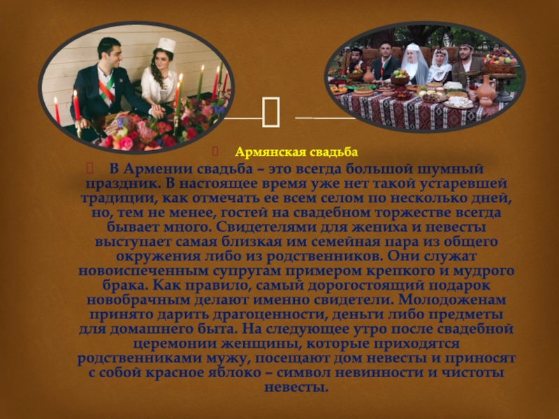 ее всем селом по несколько дней, но, тем не менее, гостей на свадебном торжестве всегда бывает много. Свидетелями для жениха и невесты выступает самая близкая им семейная пара из общего окружения либо из родственников. Они служат новоиспеченным супругам примером крепкого и мудрого брака. Как правило, самый дорогостоящий подарок новобрачным делают именно свидетели. Молодоженам принято дарить драгоценности, деньги либо предметы для домашнего быта. На следующее утро после свадебной церемонии женщины, которые приходятся родственниками мужу, посещают дом невесты и приносят с собой красное яблоко – символ невинности и чистоты невесты.