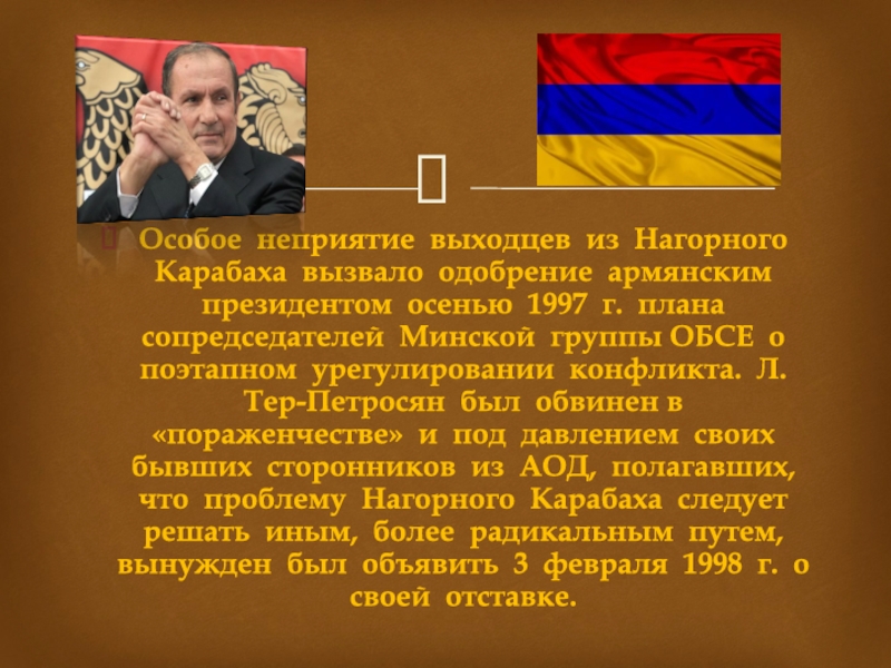 урегулировании конфликта. Л. Тер-Петросян был обвинен в «пораженчестве» и под давлением своих бывших сторонников из АОД, полагавших, что проблему Нагорного Карабаха следует решать иным, более радикальным путем, вынужден был объявить 3 февраля 1998 г. о своей отставке.