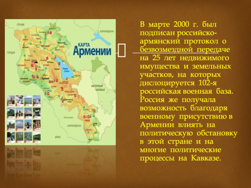 которых дислоцируется 102-я российская военная база. Россия же получала возможность благодаря военному присутствию в Армении влиять на политическую обстановку в этой стране и на многие политические процессы на Кавказе.