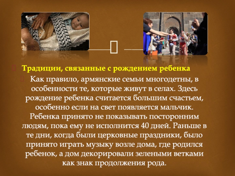 большим счастьем, особенно если на свет появляется мальчик. Ребенка принято не показывать посторонним людям, пока ему не исполнится 40 дней. Раньше в те дни, когда были церковные праздники, было принято играть музыку возле дома, где родился ребенок, а дом декорировали зелеными ветками как знак продолжения рода.