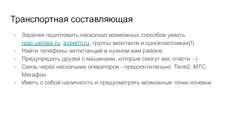 Транспортная составляющаяЗаранее подготовить несколько возможных способов уехать rasp.yandex.ru, avperm.ru, группы вконтакте и одноклассниках(!)Найти телефоны автостанций в нужном