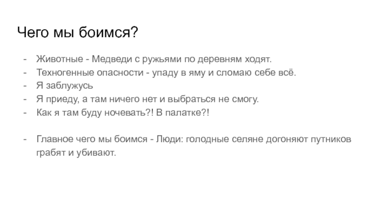 Чего мы боимся?Животные - Медведи с ружьями по деревням ходят.Техногенные опасности - упаду в яму и сломаю