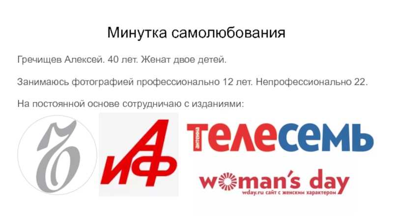 Минутка самолюбованияГречищев Алексей. 40 лет. Женат двое детей. Занимаюсь фотографией профессионально 12 лет. Непрофессионально 22.На постоянной основе сотрудничаю с изданиями: