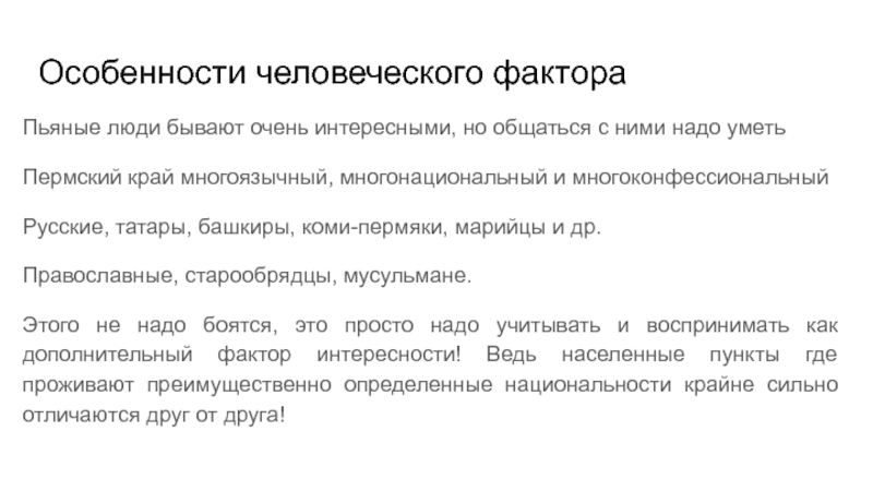 Особенности человеческого фактораПьяные люди бывают очень интересными, но общаться с ними надо уметьПермский край многоязычный, многонациональный и