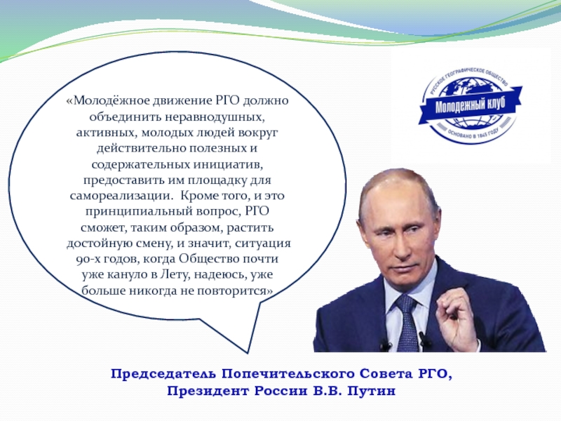 Кроме того, и это принципиальный вопрос, РГО сможет, таким образом, растить достойную смену, и значит, ситуация 90-х годов, когда Общество почти уже кануло в Лету, надеюсь, уже больше никогда не повторится»Председатель Попечительского Совета РГО,