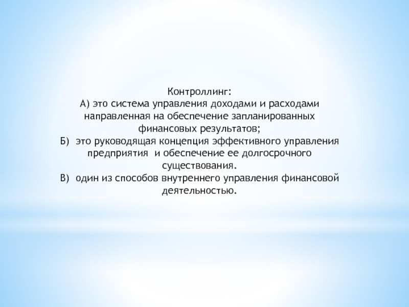 Контроллинг:А) это система управления доходами и расходами направленная на обеспечение запланированных финансовых результатов;Б)  это руководящая концепция эффективного