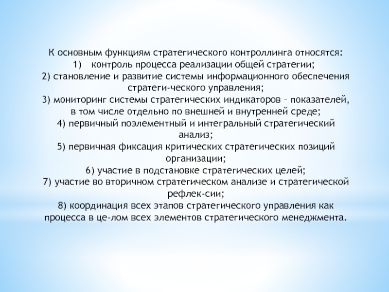 К основным функциям стратегического контроллинга относятся: контроль процесса реализации общей стратегии; 2) становление и развитие системы информационного
